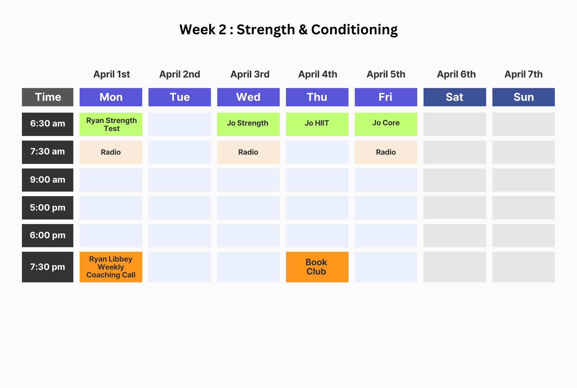 Live strength & conditioning workouts this week. A focus on building up the intensity and helping you master key exercises for performance. Start the week off with a strength test session with Ryan Libbey (which will be repeated in week 8) and fun workouts with Jo Michaels, an award-winning fitness coach!