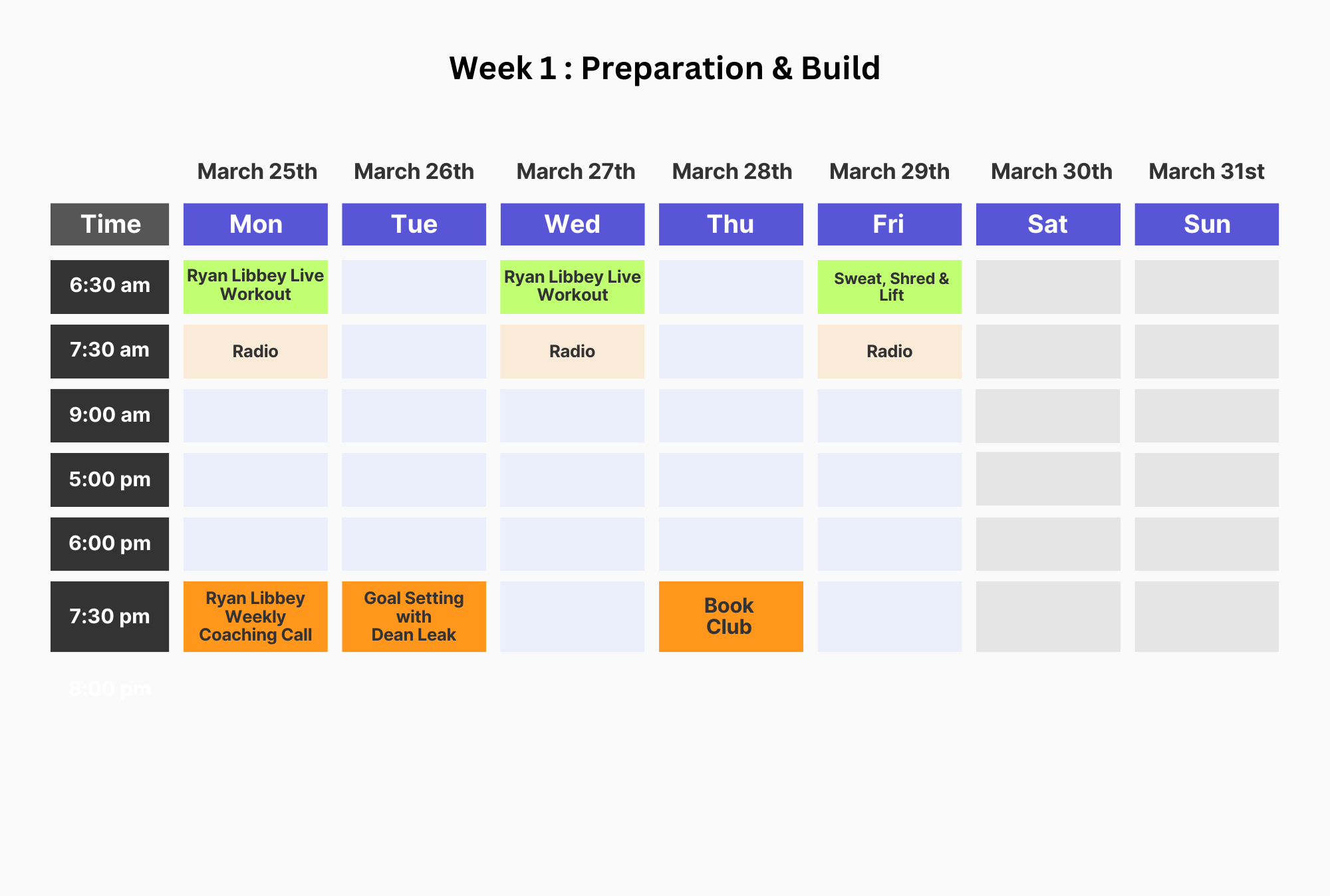 This week includes a live planning & goal setting session with former Team GB mindset coach Dean Leak & some fun workouts with Ryan Libbey. You'll get to know each other, join WhatsApp groups, listen to podcasts and get familiar with our awesome all-in-one wellness app which you'll use to track your nutrition, stress levels, menstrual cycle and more.